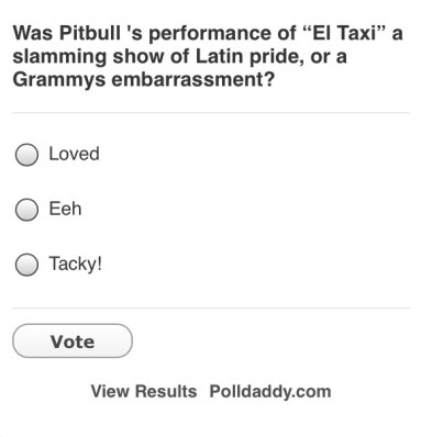 Vote ‘Loved’ for Pitbull’s GRAMMY Performance February 27, 2016 / PitbullUpdates I think we can all agree that Pitbull’s GRAMMY performance was off the chain! He closed the show with an exciting, fun, and star-packed presentation! But in a recent poll, it seems as if Billboard is trying to take aim at Pitbull and his fans by dubbing his performance, “tacky,” and, “embarrassing.” Let’s turn this negative into a positive by voting, “Loved,” on this disgraceful poll! Share: Click to share on X (Opens in new window) X Click to share on Facebook (Opens in new window) Facebook Click to email a link to a friend (Opens in new window) Email Click to print (Opens in new window) Print More Click to share on LinkedIn (Opens in new window) LinkedIn Click to share on Pinterest (Opens in new window) Pinterest Click to share on Reddit (Opens in new window) Reddit Click to share on Pocket (Opens in new window) Pocket Click to share on Tumblr (Opens in new window) Tumblr Like Loading... Related